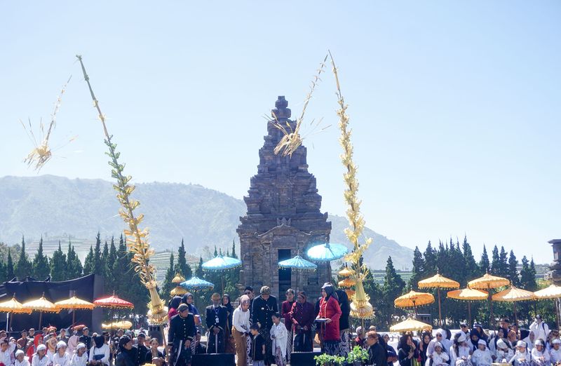 SEBANYAK 13 anak berambut gimbal atau gembel menjalani ruwatan massal dalam pergelaran Dieng Culture Festival (DCF) XIV Pahamn 2024 di Kompleks Candi Arjuna, Desa Dieng Kulon, Kabupaten Banjarnegara, Jawa Tengah, Sabtu (24/8).