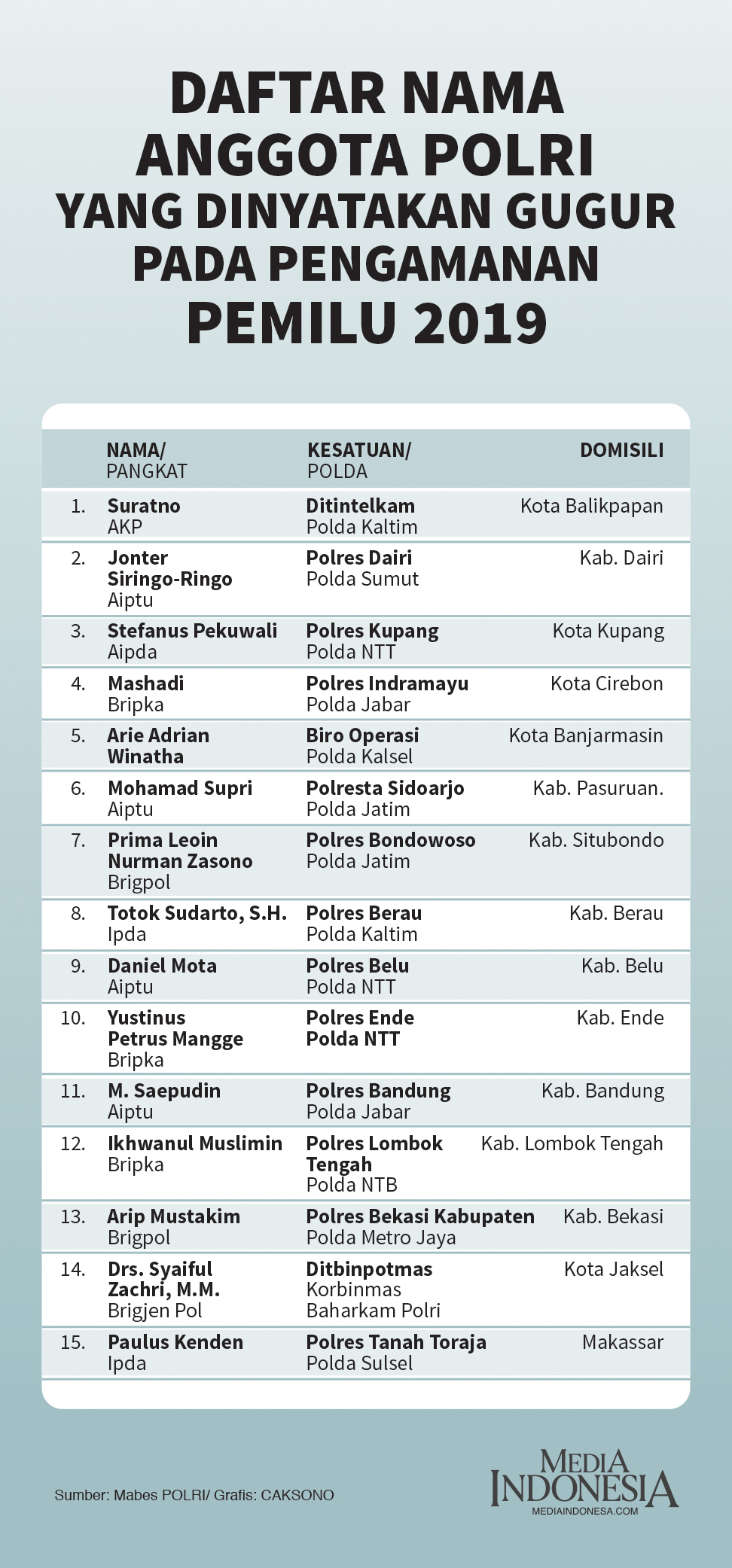 Infografis 11/05/2025 Belasan Personel Polisi Gugur Demi Kawal Pemilu 2019 Diposkan Oleh:administrator infografis(caksono) Belasan personel Polri gugur Demi mengamankan Pemilu 2019. Para Personil korps Tri Brata yang gugur tersebut bertugas di berbagai daerah di Tanah Air. Baca juga: [INFOGRAFIS] Komparasi Pemilu dalam Bilangan Cek Artikel: Jumlah Kasus Aktif Covid-19 Menurun