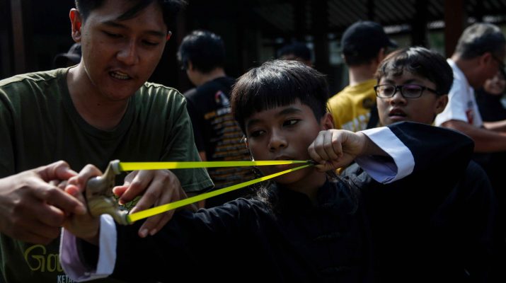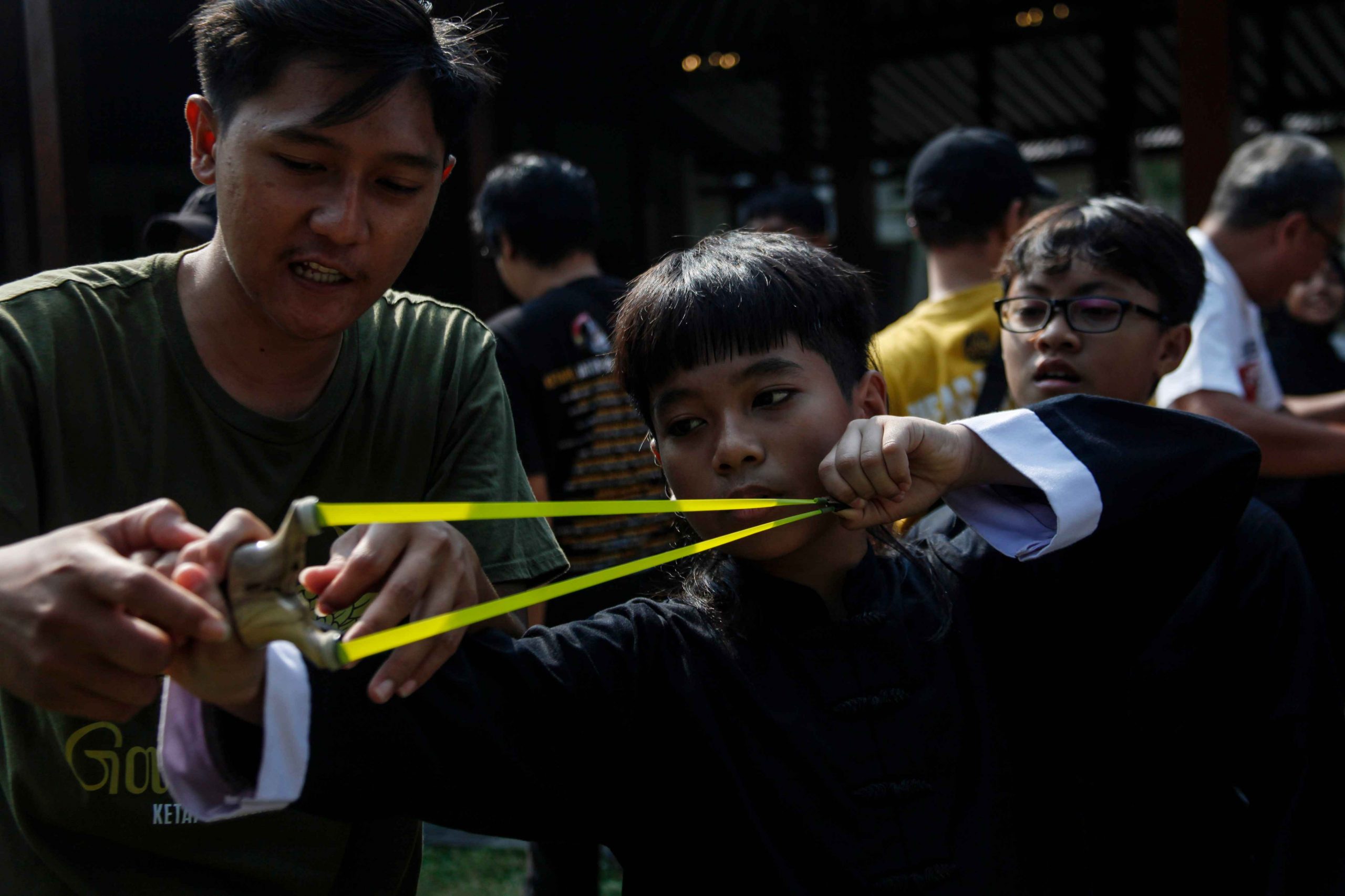 Instruktur memberikan arahan Metode memegang katapel kepada seorang anak pada Festival Budaya Surakarta di Ndalem Joyokusuman Solo, Jawa Tengah, Sabtu (21/6/2025). Selain mengenalkan katapel sebagai salah satu cabang olahraga, kegiatan yang juga diisi dengan berbagai permainan tradisional itu bertujuan Kepada melestarikan kekayaan budaya Indonesia sekaligus promosi pariwisata dan ekonomi kreatif di Kota Solo. ANTARA FOTO/Maulana Surya/Ppj