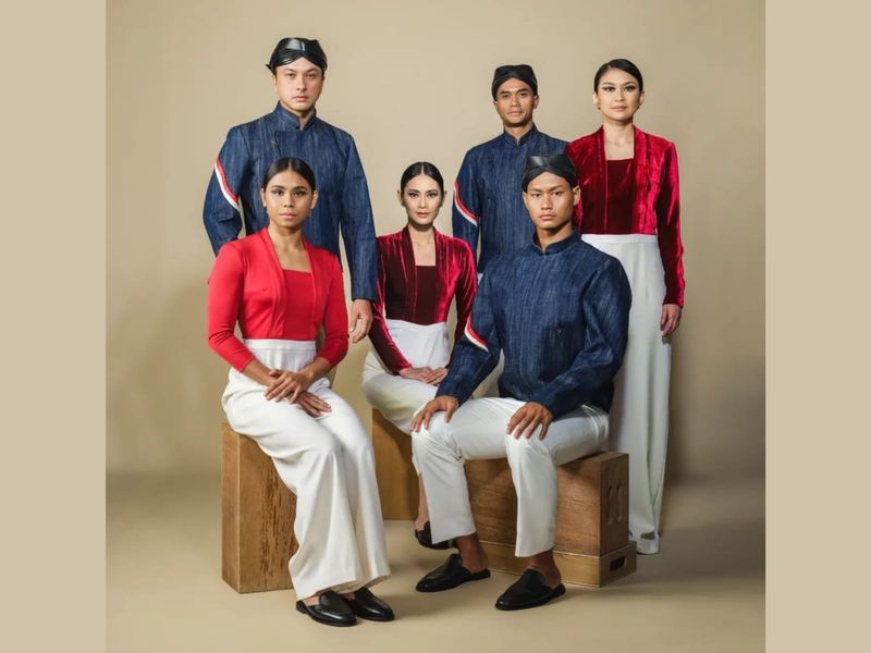 Kepada seragam perempuannya, model kebaya kutubaru berwarna merah dibuat menjadi jumpsuit dengan palazzo putih. Kebaya itu tampak ada menggunakan bahan velvet dan ada pula yang menggunakan jersey sutra.