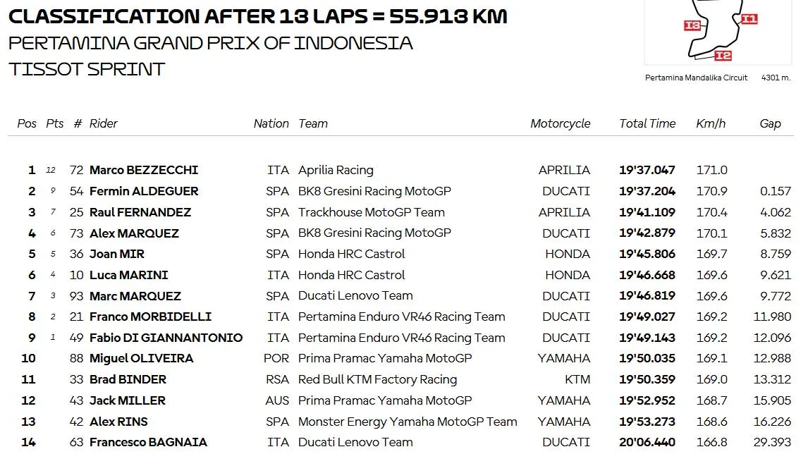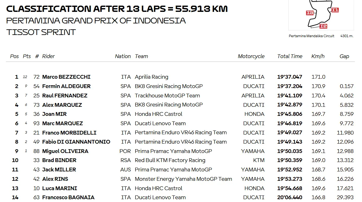 Dan akhirnnya setelah 13 Lap Marco Bezzecchi Memenangkan Sprint race MotoGP Mandalika – Indonesia 2025. Aldeguer P2, Raul Fernandez P3. Marc Marquez P7 dan Bisa berubah karena Marini di P6 kena Penyelidikan tekanan Ban.