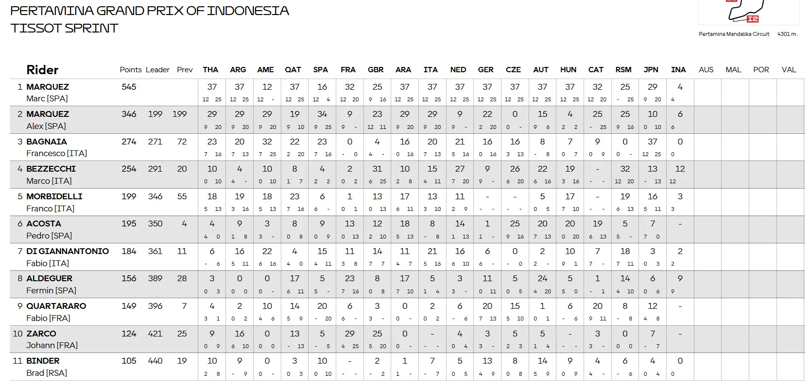 Pasca Sprint mandalika 2025, Bezzecchi semakin mendekat ke Bagnaia dengan Jarak sekarang hanya 20 Point. sementara Bagnaia ke Alex Marquez berkembang jadi 72 Point.