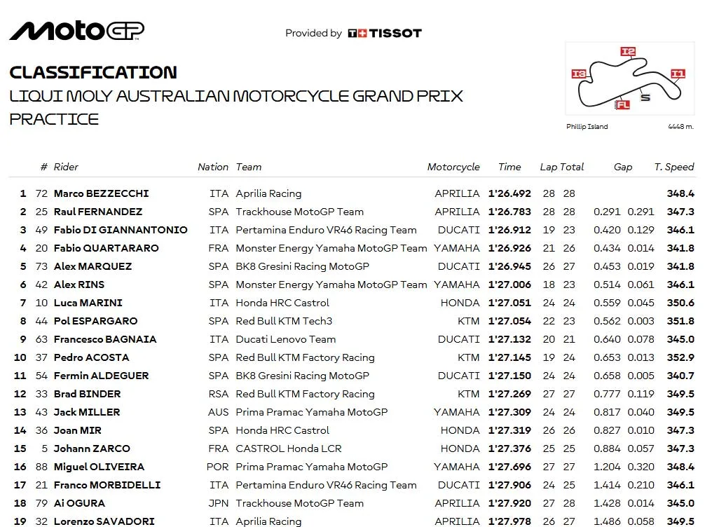 Dan setelah 60 Menit Marco Bezzecchi dengan 1:26 492  hadir sebagai yang Tercepat sesi Practice MotoGP Australia 2025 dan memimpin 9 pebalap Lainnya ( Raul, Diggia, Quartararo, Alex Marquez, Rins, Marini, Pol Espargaro,  Bagnaia dan Acosta ) Langsung memperoleh tempat ke sesi Q2 esok Sabtu.