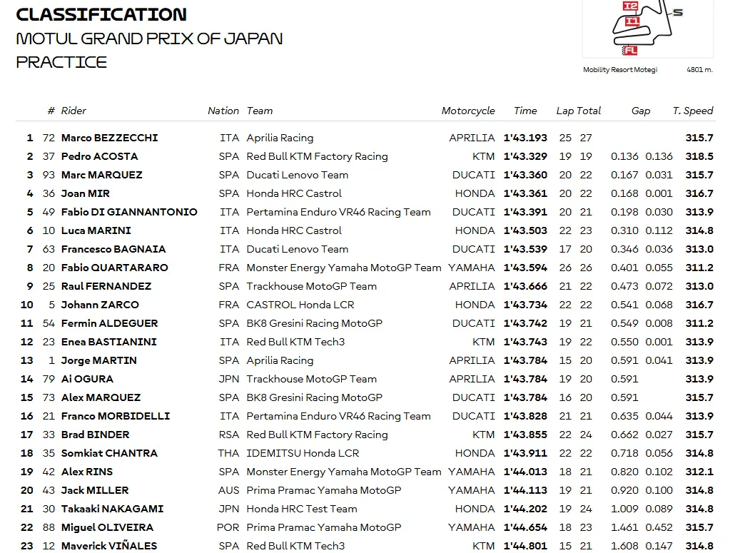 Dan setelah 60 menit Marco Bezzecchi tampil sebagai yang tercepat Sesi Practice MotoGP Motegi 2025 dan memimpin 9 pebalap Lainnya ( Acosta, Marc, Mir, Diggia, Marini, Pecco, Quartararo dan Zarco ) langsung ke Sesi Kualifikasi ke-2 ( Q2) esok Sabtu.