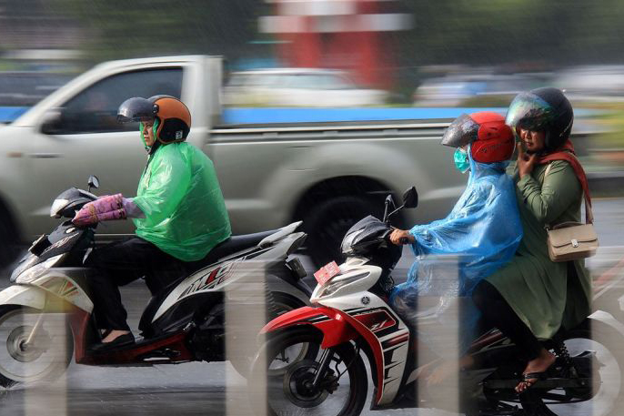 Ilustrasi – Sejumlah pengendara motor melintas Ketika hujan. ANTARA FOTO/Jessica Wuysang/nym/pri.