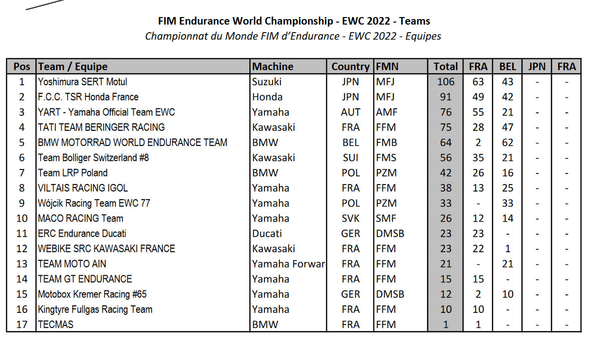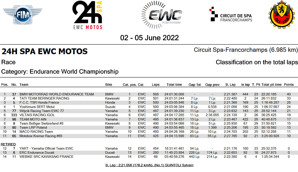 Terlepas dari kondisi trek Spa-Francorchamps yang menantang, Rea dan Siméon terlibat dalam pertempuran sengit Buat posisi dengan Rea keluar sebagai yang teratas setelah beberapa perubahan posisi. Hasilnya berarti Yoshimura SERT Motul yang ditenagai Suzuki GSX-R1000RR, pemenang FIM Endurance World Championship musim Lampau dan 24 Heures Motos di Le Mans pada April finish P4 Tetapi Lagi memimpin Championship dengan Keistimewaan 15 poin dari kejaran FCC TSR Honda dalam perburuan gelar menuju Suzuka 8 Hours bulan Agustus 2022 yang akan datang.