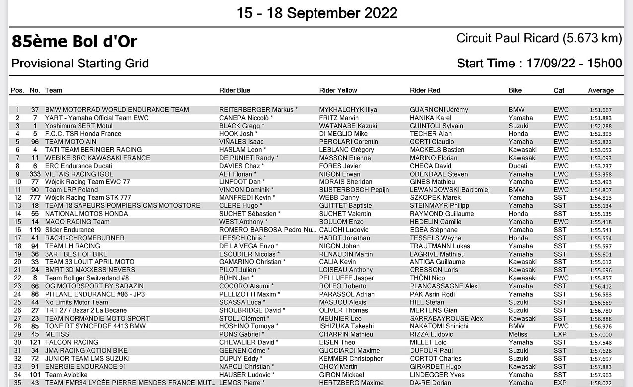 Markus Rieterberger meraih catatan terbaik 1:51,693 sementara Illya Mykhalchyk meraih 1:51,641 serta didaulat sebagai reokor baru pebalap EWC tercepat di Sirkuit Paul Ricard. Data dari BMW Motorrad World Endurance mengkonfirmasi Mykhalchyk mencapai kecepatan tertinggi 342km/jam di Mistral Straight yang terkenal.