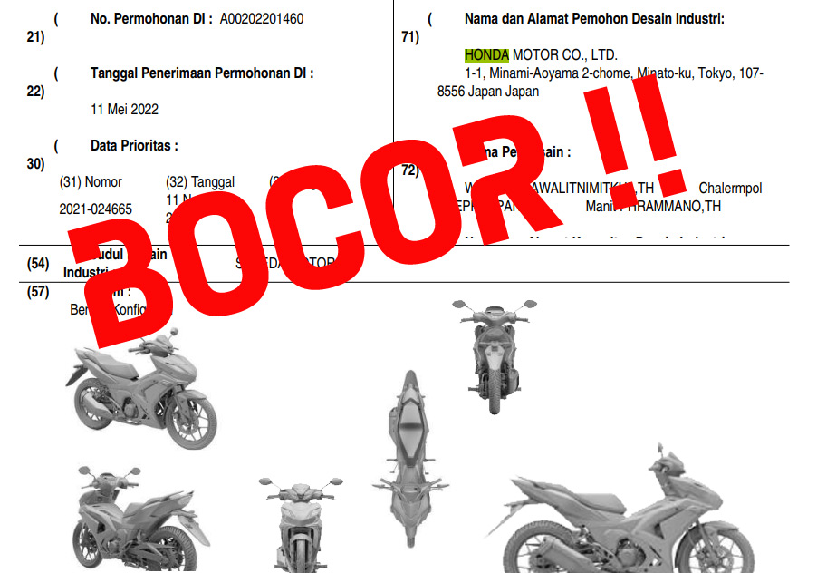 Desain Motor bebek super yang secara tongkrongan mungkin malah dekat ke Desain MX King ini di desain oleh tiga Desainer Honda asal Thailand dan sudah didasftarkan semenjak Mei 2022 Demi Indonesia. Secara Standar desian terakhir yang juga dihadirkan pendaftarannya sudha dirilis semenjak Dekat setahun yang Lampau, di awal tahun 2022 lebih tepatnya.
