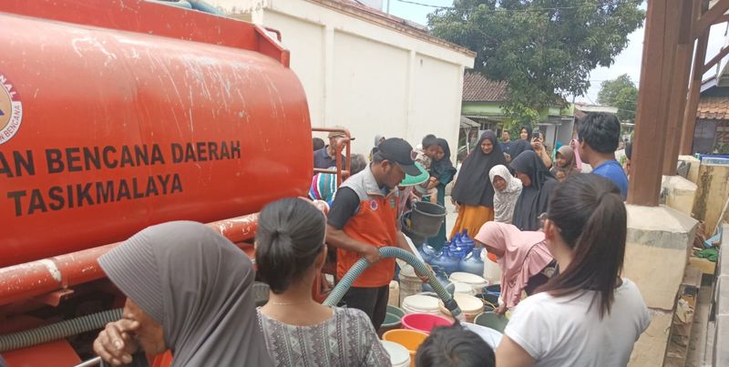 BADAN Penanggulangan Bencana Daerah (BPBD) Kabupaten Tasikmalaya, Jawa Barat mendistribusikan air bersih kepada warga Serang, Kecamatan Salawu. Dalam dua bulan terakhir, warga terdampak kekeringan.