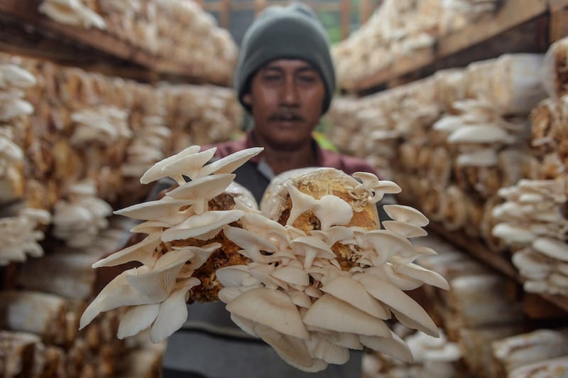 Petani memanen jamur tiram di Kasemen, Kota Serang, Banten, Selasa (10/12/2024). Budidaya jamur dengan media tanam bahan organik tersebut dapat dipanen hingga delapan ton dalam kurun waktu enam bulan dan dijual dengan harga Rp13 ribu-Rp15 ribu per kilogram. ANTARA FOTO/Putra M. Akbar/sas