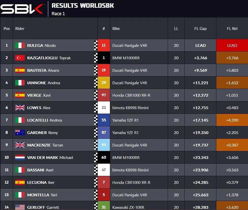 dan akhirnnya setelah 20 lap Nicolo Bulega Memenangkan race 1 WSBK Jerez 2025. Toprak P2 dan dengan ini Toprak Belum Dapat mengunci gelar Pemenang dunia WSBK 2025 Pasca Race 1. Jarak Toprak Ke Bulega di Klasemen pebalap mengecil dari 39 point ke 34 Point diantara mereka jelang Superpole Race esok Ahad. Tetapi Toprak kembali memperoleh kesempatan selanjutanya Kepada Mengunci gelar pasca Superpole Race esok.