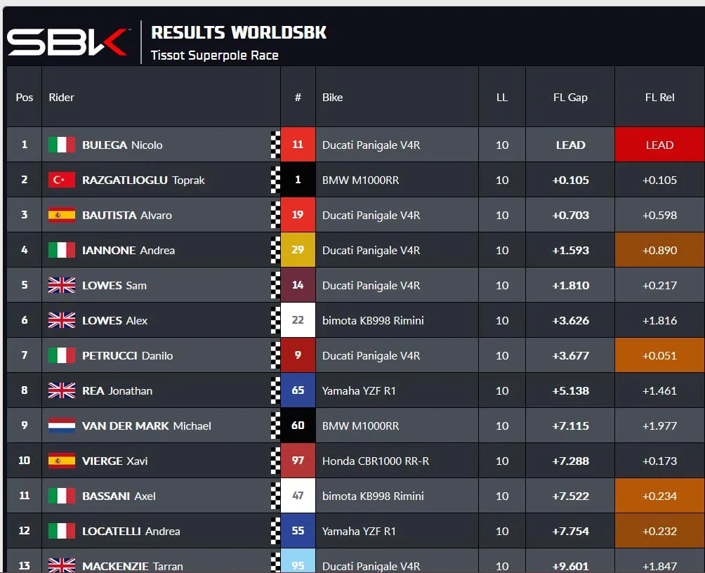 Lap terakhir bulega memimpin dan akhirnnya setelah 10 Lap Nicolo Bulega Memenangkan Superpole Race WSBK Aragon 2025. Toprak P2, Bautista P3