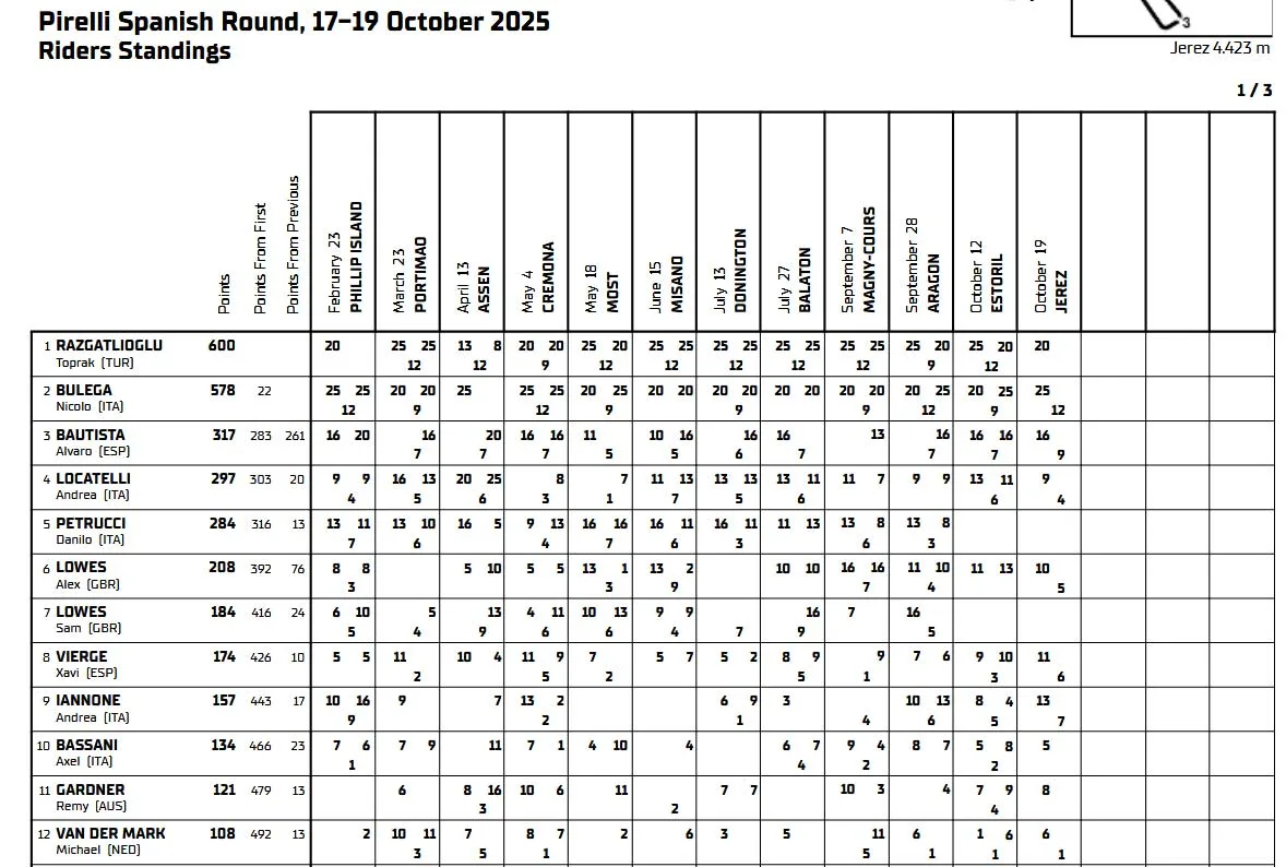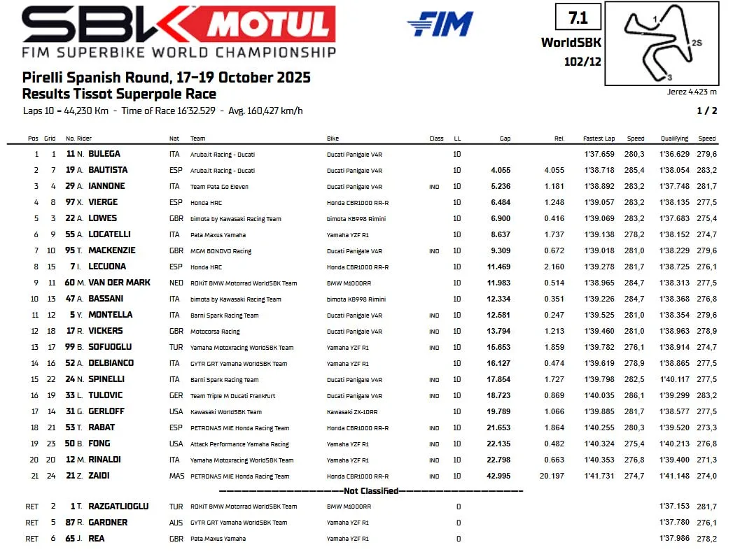 Sementara itu Toprak Razgatlioglu DNF akibat Clash dengan Bulega yang sebenarnya Membikin Bulega sempat Memperoleh Hukuman 1 x LLP karena dianggap melakukan Manuver yang Tak bertanggung jawab.