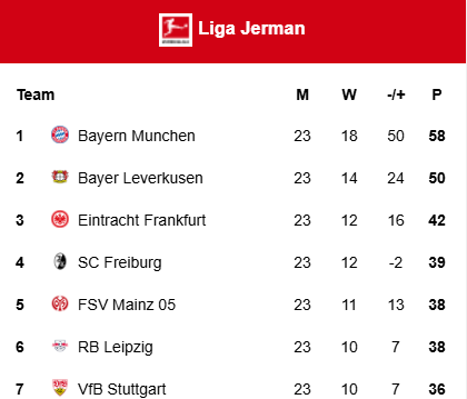 KLUB Bayern Muenchen berjaya di puncak klasemen setelah menekuk VfB Stuttgart dengan skor 3-1 pada pekan ke-24 Bundesliga atau Aliansi Jerman di Stadion Mercedes-Benz Arena, Muenchen, Sabtu Pagi hari WIB. Stuttgart sempat unggul lewat gol Angelo Stiller, tetapi Bayern Muenchen dapat membalikkan keadaan melalui tendangan Michael Olise, Leon Goretzka dan Kingsley Coman yang menembus gawang Musuh. Kemenangan Bayern Muenchen Membikin klub itu tak tergeser dari klasemen sementara Aliansi Jerman atau Bundesliga dengan koleksi 61 poin dari 24 pertandingan.