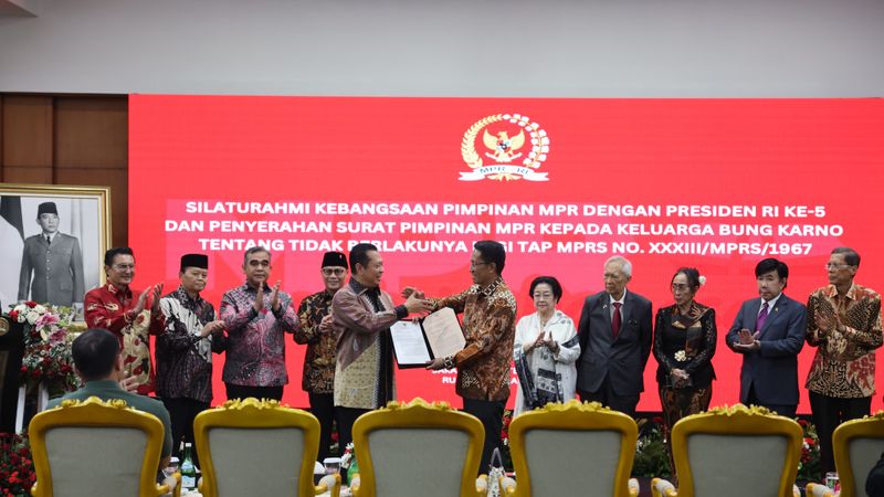 Liputanindo.id – Majelis Permusyawaratan Rakyat (MPR) menyerahkan surat tak berlakunya TAP MPRS  Nomor XXXIII/MPRS/1967 kepada keluarga besar Presiden pertama RI Soekarno atau Bung Karno di Gedung Nusantara V, Kompleks Parlemen, Senayan, Jakarta, Senin (9/8/2024).