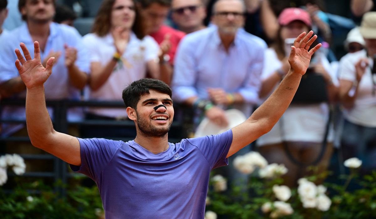 CARLOS Alcaraz menang 6-3, 3-6, dan 7-5 atas Karen Khachanov Buat melaju ke perempat final turnamen ATP Masters 1000 Internazionali BNL d’Italia atau Roma Masters, Selasa (13/5).