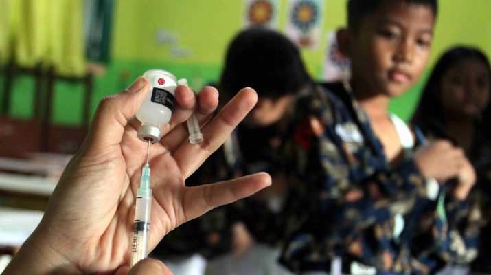 Petugas medis menyuntikkan vaksin kepada seorang siswa Ketika Penyelenggaraan Cek Kesehatan Gratis (CKG) dan Bulan Imunisasi Anak Sekolah (BIAS) di SDN Tanjungrejo 5, Kota