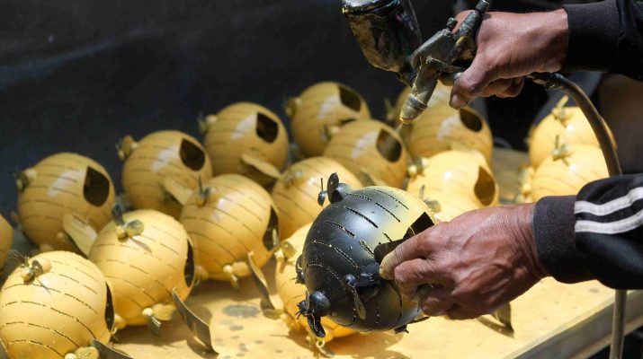 Pekerja menyelesaikan pembuatan kerajinan hiasan berbahan plat besi Kepada dikirim ke luar negeri di Tabanan, Bali, Rabu (24/9/2025). Pemprov Bali melakukan pembinaan kepada UMKM