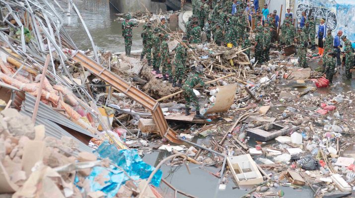 Prajurit TNI Serempak petugas kebersihan dan Penduduk bergotong-royong membersihkan sampah dan puing-puing bangunan yang hanyut akibat diterjang banjir di Sungai Badung, Denpasar, Bali, Minggu