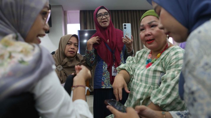 Peserta program Emak-emak matic berdiskusi Golongan dan Membangun konten Ketika mengikuti pelatihan Membangun konten video di Jakarta Pusat, Selasa (16/9/2025). Kementerian Pemberdayaan Perempuan dan