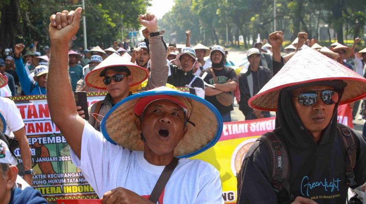 Pengunjuk rasa membawa poster aspirasi Demi aksi Hari Tani Nasional ke-65 di Jalan Merdeka Selatan, Jakarta, Rabu (24/9/2025). Perkumpulan Petani Indonesia dari sejumlah daerah