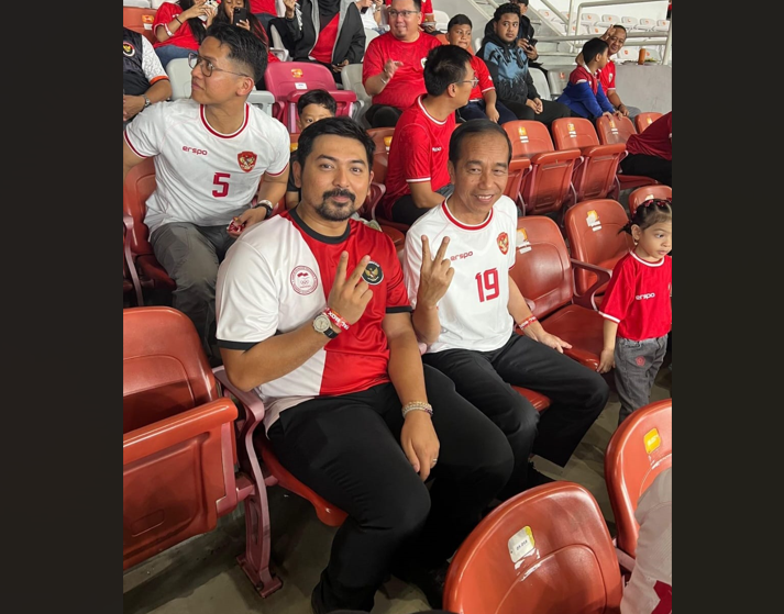 CALON Wakil Bupati Luwu Timur Nomor Urut 2, Mochamad Akbar Andi Leluasa menyaksikan pertandingan kualifikasi Piala Dunia antara Indonesia melawan Arab Saudi di Stadion Primer Gelora Bung Karno (GBK), Jakarta, Selasa (19/11). Akbar, hadir di GBK dan duduk bersebelahan dengan Presiden ke-7 Joko Widodo (Jokowi).