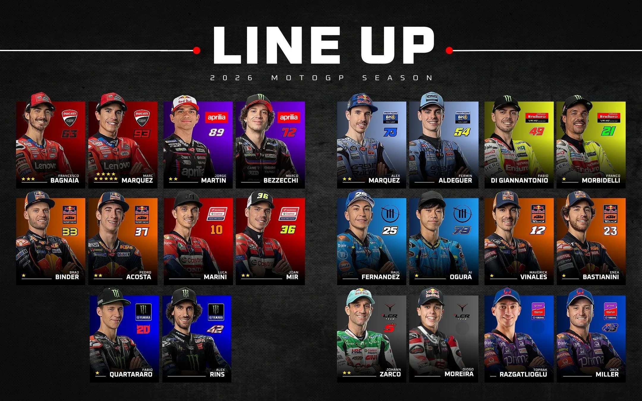 Yap total Eksis 22 Pembalap yang mengisi entry List MotoGP 2026 per har ini. Ducati paling banyak Mempunyai pebalap Tetapi dari 6 rider Ducati terbagi 2 jenis Motor, Eksis tiga pebalap yang menggunakan GP26 terbaru, Eksis juga tiga pebalap lain yang menggunakan GP25. Secara Lumrah sepertinya hanya ducati yang akan menghomologasikan dua model Tahun Motor Buat Musim 2026 nanti