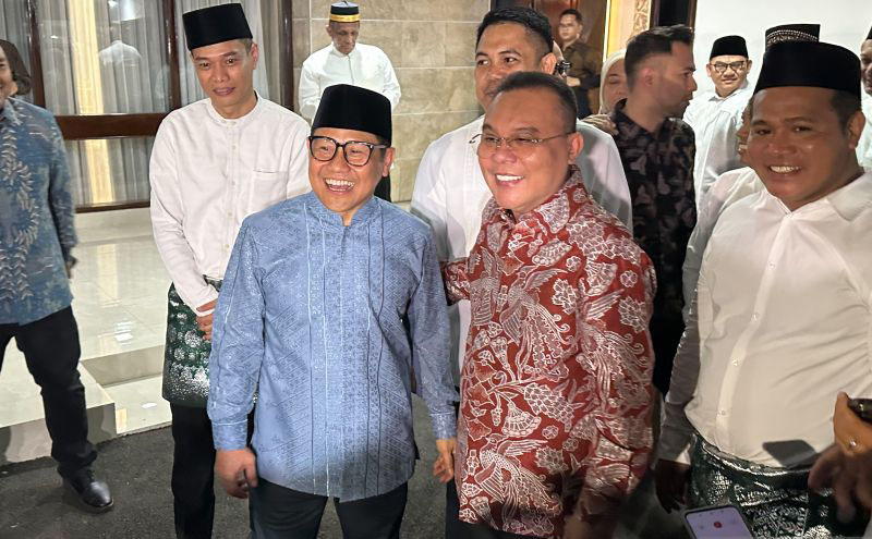 “Ini bukan Surya, ini bulan,” ujar Dasco sembari menepuk punggung Cak Imin di hadapan media usai menghadiri acara halalbihalal di Jakarta, Minggu.