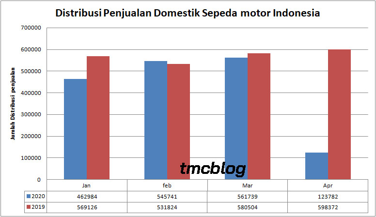 Tercatat pada Bulan April 2020, Secara keseluruhan ke lima Pabrikan Sepeda motor di Indonesia yang tergabung di AISI hanya mencatat 123.782 unit Distribusi Penjualan Domestik Sepeda motor lintas tipe, lintas Brand. Nomor ini artinya Turun 78% dibandingkan dengan data di bulan sebelumnya, maret 2020 yang tercatat 561.739 unit.