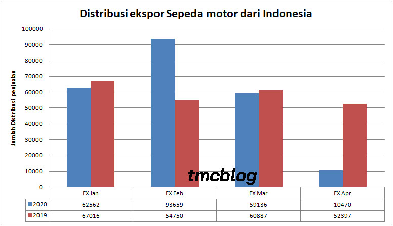 Pandemi yang berlaku secara Mendunia juga berefek pada Penjualan ekspor yang Juga mengalami penurunan sob. Di Bulan April 2020 hanya 10.470 Unit Sepeda Motor indonesia yang di ekspor ke luar negeri. Ini turun Nyaris 82% dibandingkan bulan Sebelumnya Maret 2020 dan turun 80% dibandingkan Bulan April 2019. Secara Lumrah Jumlah ekspor di 4 bulan pertama 2020 tercatat 225.827 Unit dan ini turun 4 % dari torehan ekspor 4 bulan pertama tahun 2019 yang mencatatkan Nomor 235.050 unit.