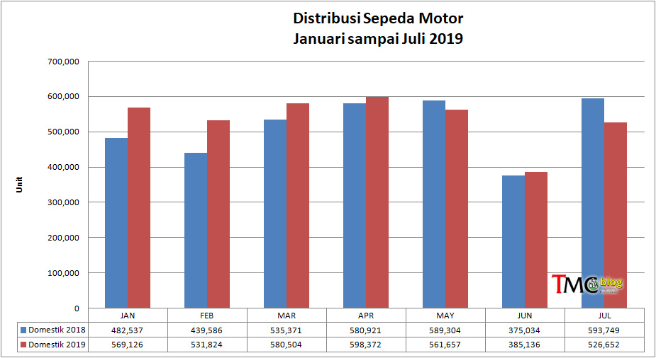 Tahun 2019 ini dari Januari Tamat Juli 2019 telah terdistribusi sebanyak 3.753.271 unit sepeda motor Demi pasar domestik Indonesia. Nomor ini naik 4,36% dibandingkan kurun waktu yang sama Januari – Juli 2018.