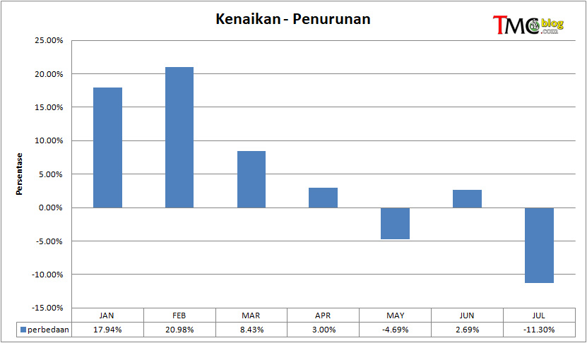 Kalau bicara persentase kenaikan, bukan Januari (17,94%) dan Februari 2019 (20,98%) jauh di atas kenaikan rata-rata 7 bulan terakhir 2019. Sementara itu Juli 2019 Nomor persentase penurunannya cukup parah yakni sebesar 11,30% .