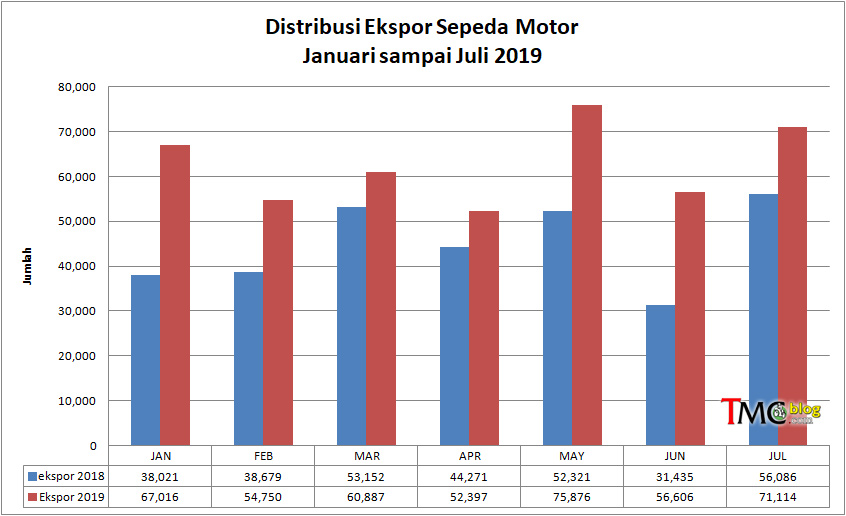 Sementara itu untku ekspor sepeda motor Indonesia ke negeri sebrang secara Standar pada rentang bulan Januari -Juli 2019 telah terkirim sebanyak 438.646 unit sepda motor ke berbagai negara luar. Nomor ini naik 39,71% dibandingkan kurun waktu yang sama tahun 2018. Secara Standar ekspor sepeda motor Indonesia mengalami kenaikan di Segala bulan dari 7 bulan pertama 2019.