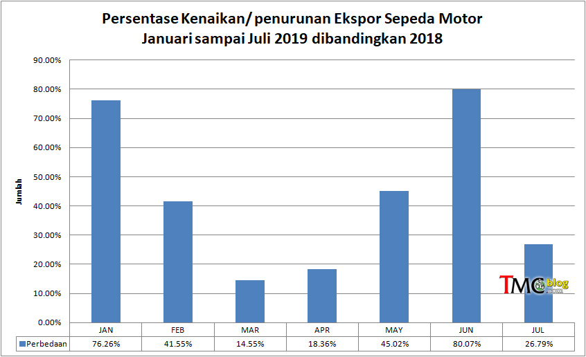 Kalau dibandingkan head to head dengan bulan yang sama di tahun 2018, maka Juni 2019 adlah bulan dimana persentase ekspor sepeda motor tertinggi yakni mencapai kenaikan 80% disusul Januari sebanyak 76,26% . .. Waaaa, penyumbang devisa dong yah.