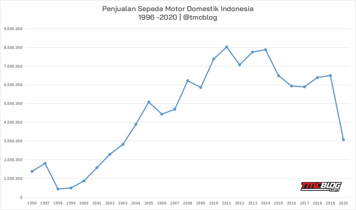 Dilihat dari Jumlah Sepeda motor baru yang didistribusikan penjualannya Yakni sebesar 3.660.616 Unit , market sepeda motor Indonesia Tahun 2020 seperti Kembali Ke Era antara 2003 – 2004. Smeentara itu rekor penjualan terbaik Domestik Indoensia sepeda Motor Lagi dipegang di tahun 2011 dengan Nomor 8,012 Juta unit Sepeda motor baru terjual pada tahun fiskal tersebut
