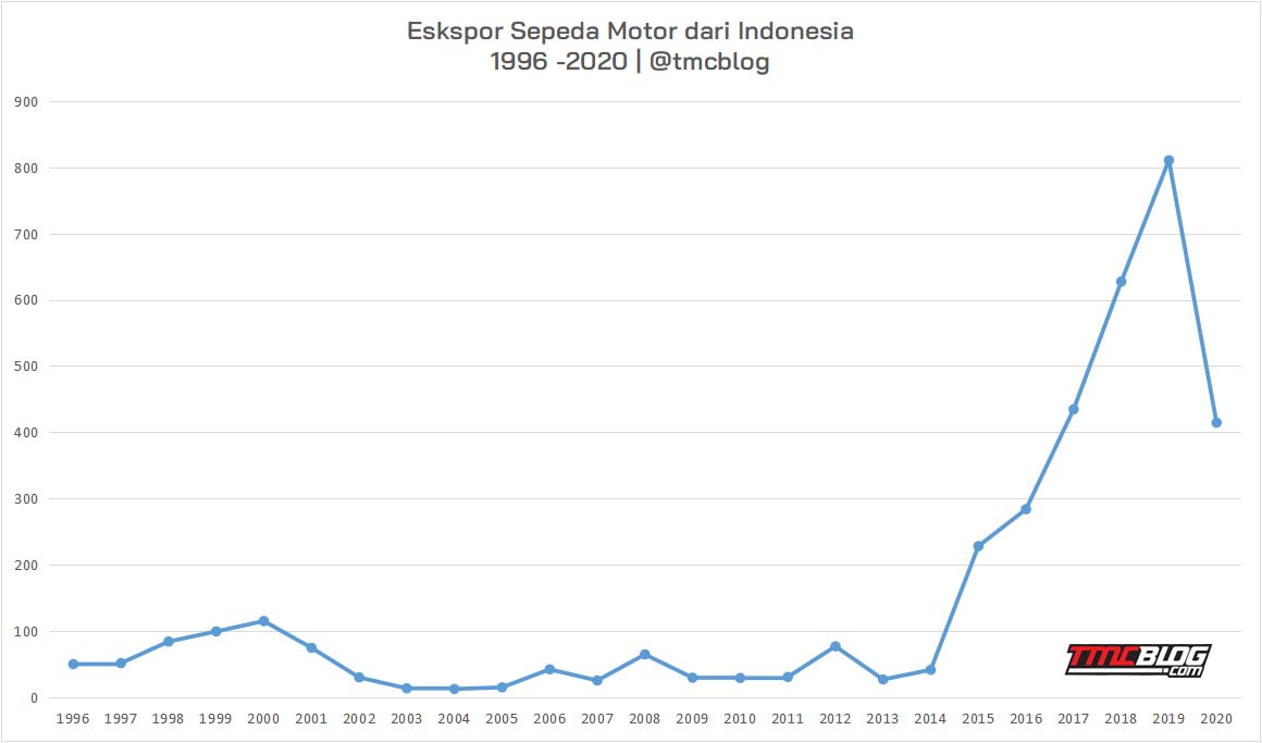 Sementara itu Nilai Ekspor Kendaraan Roda dua baru di 2020 tembus sebanyak 700.392 Unit atau hanya turun 13,6% dibandingkan dengan Jumlah Produk Sepeda motor yang di ekspor dari Indonesia tahun sebelumnya 2019 yakni sebanyak 810.433.