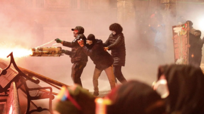 Petugas bertopeng dengan perlengkapan anti huru hara menembakkan peluru karet, gas air mata, dan meriam air Begitu mereka bergerak Kepada membubarkan pengunjuk rasa yang melemparkan kembang api, sementara api terlihat keluar dari jendela gedung parlemen.