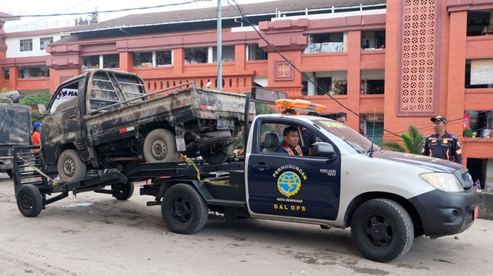 Petugas derek mobil Punya Kaum yang terdampak bencana banjir Demi dibawa ke bengkel di Pasar Badung, Denpasar, Bali, Minggu (14/9/2025). Pemerintah Kota Denpasar menyediakan layanan derek gratis bagi pedagang dan Kaum yang kendaraannya terdampak banjir di area parkir Rendah tanah di pasar itu dengan jumlah 45 mobil dan 35 sepeda motor. ANTARA/Nyoman Hendra Wibowo/gus