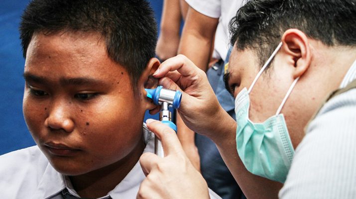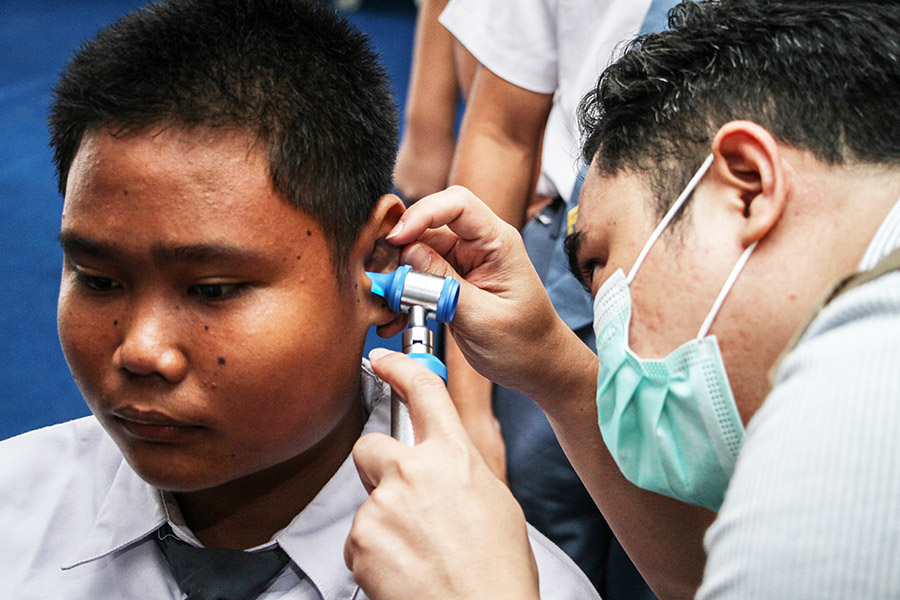 Petugas kesehatan memeriksa kesehatan telinga siswa Ketika Cek Kesehatan Gratis (CKG) di SMA Negeri 2 Palangka Raya, Kalimantan Tengah, Selasa (19/8/2025). Pemprov Kalimantan Tengah mulai menggelar CKG yang menyasar pelajar dari jenjang PAUD hingga SMA sederajat guna mendeteksi masalah kesehatan sejak Awal yang berpotensi mengganggu preses belajar mengajar. ANTARA/Auliya Rahman/gus