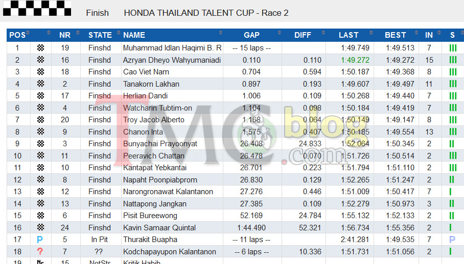 Dengan hasil ini Cao Vietnam yang finish Posisi 3 memperoleh 15 point sehingga point Totalnya 168 sementara Dheyo yang di race ini mengoleksi 20 point nilainya 160 dan Watcharin yang finish di Posisi 6 dan memperleh 10 point Nilai total Pointnya Tiba Race ini adalah 166. So menurut perhitungan liputanindo pembalap Indonesia Dheyo Wahyu Finish musim TTC 2019 ini di Posisi 3 setelah Cao Vietnam dan Watcharin Tub tim On