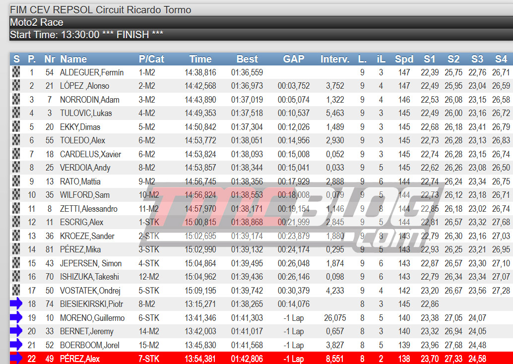 Lap 7 Aldeguer memimpin dua detik di depan Alonso, Dimas Posisi 5. Setelah 9 Lap Restart race Tampil Fermin Aldeguer Sebagai Pemenang disusul Alonso Lopez dan Adam Norrodin. Pembalap Indonesia, Dimas Ekky Finish di posisi 5.