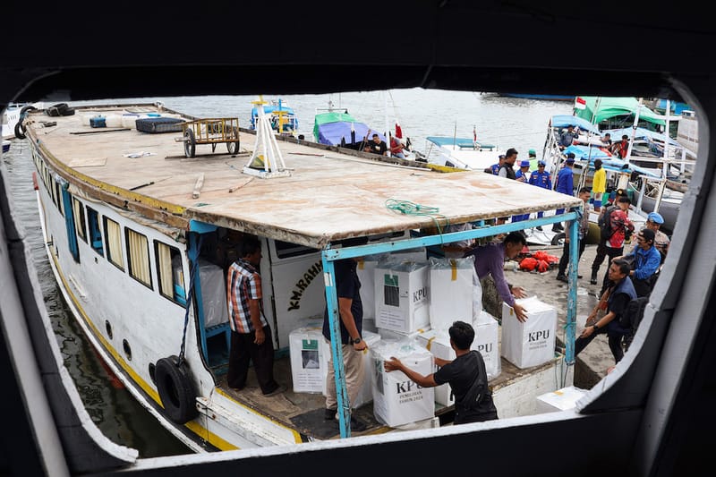 Pekerja mengangkut logistik Pilkada ke atas kapal Demi didistribusikan ke sejumlah pulau di Pelabuhan Rakyat Paotere, Makassar, Sulawesi Selatan, Minggu (24/11/2024). KPU Kota Makassar mendistribusikan logistik Pilkada 2024 ke 21 TPS yang tersebar di lima pulau di Kecamatan Sangkarrang, Makassar dengan dikawal oleh 21 personel polisi dari Polres Pelabuhan Makassar. ANTARA FOTO/Arnas Padda/sas