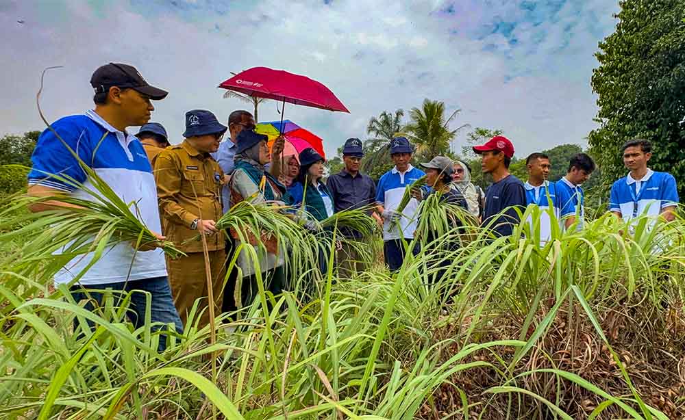 Petani Serai Wangi binaan Yayasan Astra-YDBA, Kasman dan Riko Sugiarto (keenam dan keempat dari kanan) menjelaskan proses pemanenan serai wangi kepada Dirjen Industri Kecil, Menengah, dan Aneka (Dirjen IKMA) Kementerian Perindustrian Republik Indonesia, Reni Yanita (ketiga kiri) didampingi Direktur IKM Kimia, Pakaian, dan Kerajinan, Budi Setiawan (tengah kiri), Kepala Bidang Perindustrian Provinsi Banten, Iwan Hermawan, (kedua kiri),Kepala Bidang Perindustrian Kabupaten Lebak, Nopia Nur Fitri (kelima kanan), serta didampingi Sekretaris Pengurus YDBA, Ema Poedjiwati (keempat kiri), Bendahara YDBA, Mulia K. Sampurno (kiri) dan Advisor YDBA, Setyo Budi Anang Yuliarto (tengah kanan) di area tanaman serai wangi di Lebak Banten, Jumat (12/9/2025). Penyampaian proses pemanenan serai wangi ini merupakan bagian dalam acara kunjungan Dirjen IKMA Kemenperin RI ke IKM Serai Wangi Binaan Yayasan Astra – Yayasan Dharma Bhakti Astra (YDBA). Kunjungan ini bertujuan Buat memperkuat rantai pasok antara sektor pertanian dan industri pengolahan, terutama di bidang kosmetika, yang membutuhkan minyak esensial sebagai bahan baku Primer. MI/Usman Iskandar