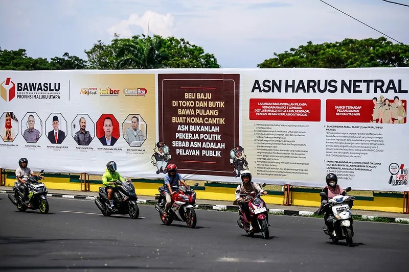 Sejumlah kendaraan roda dua melintas di depan baliho sosialisasi yang terpasang di pinggir jalan Pemuda Ternate, Maluku Utara, Jumat (27/9).(ANTARA/ANDRI SAPUTRA)