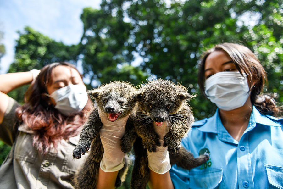 Dokter hewan menunjukan bayi Binturong (Arctictis binturong) di Kebun Binatang Bandung, Jawa Barat, Senin (2/6/2025). Kebun Binatang Bandung menambah koleksi satwanya dengan Kelahiran dua bayi Binturong pada 17 April 2025 dari indukan bernama Bunder dan Bibi sehingga jumlah Binturong di lembaga konservasi tersebut kini menjadi 33 ekor. ANTARA/Raisan Al Farisi/gus
