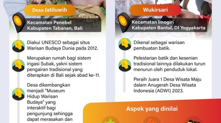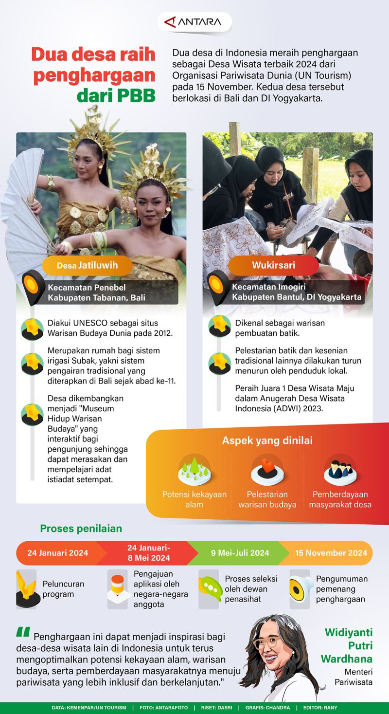 Travel 29/11/2024 Dua desa raih penghargaan dari PBB Diposkan Oleh:administrator Rabu, 20 November 2024 11:00 WIB Dua desa di Indonesia meraih penghargaan sebagai salah satu Desa Wisata terbaik 2024 dari Organisasi Pariwisata Dunia (UN Tourism) pada 15 November. Kedua desa tersebut berlokasi di Bali dan DI Yogyakarta. Cek Artikel: Keindahan Pantai Merah di Liaoning China