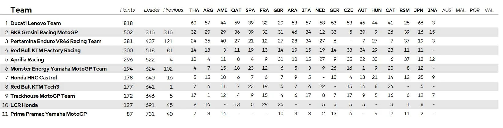 Pasca Gelaran Sprint dimana Ducati lenovo hanya meraih 3 point ( Hanya point Marc )   . . . Membangun Jarak Ducati Lenovo Ke Gresini racing menjadi 316 poin yanga rtinya lebih besar dari Point maksimum tersisa ( 309 Poin ).