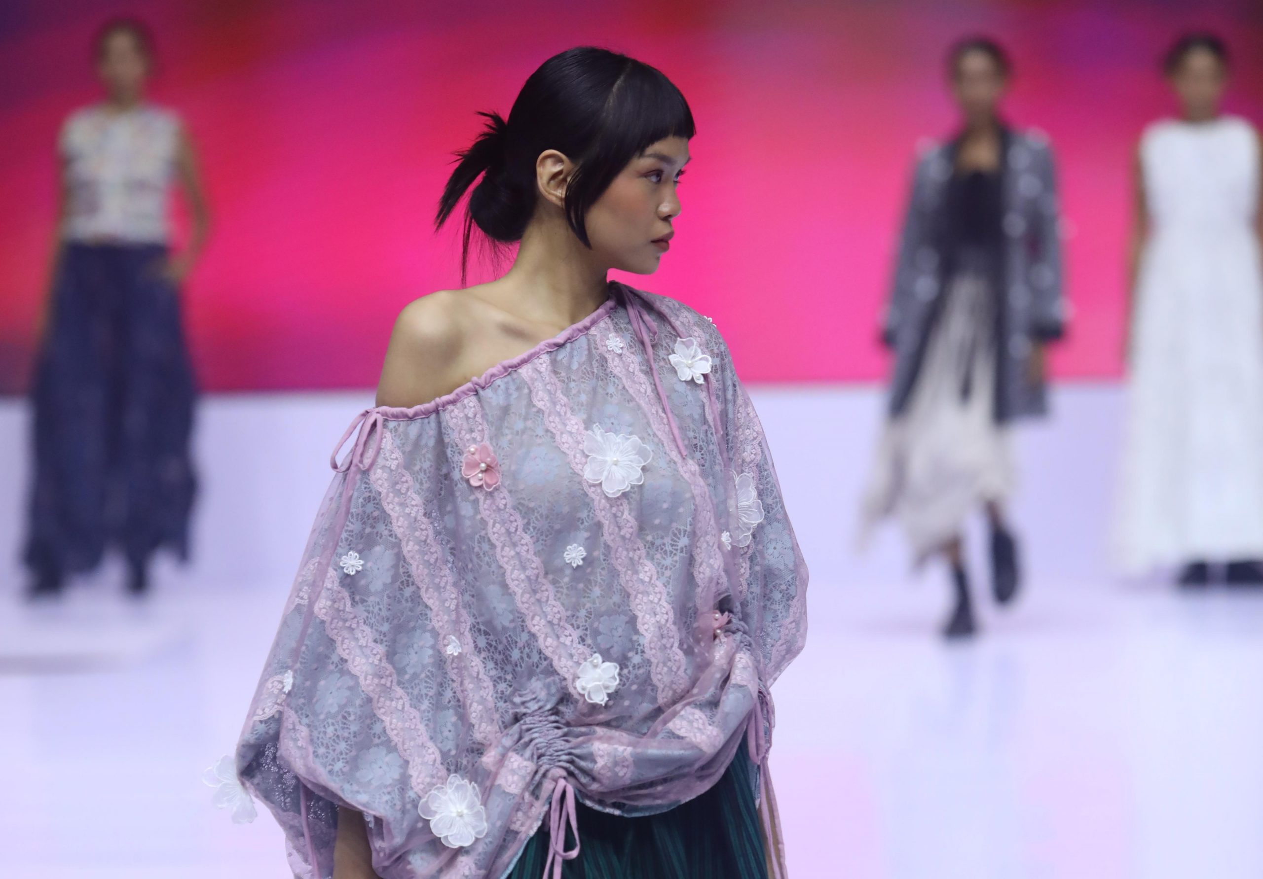 Model memperagakan hasil rancangan dari brand fashionpreneur pilihan DOKU pada puncak Indonesia Fashion Week (IFW) 2025 di Plenary Hall Jakarta International Convention Center, Jakarta, Minggu (1/6/2025). Dalam perhelatan puncak tersebut IFW berkolaborasi dengan DOKU menampilkan karya desain enam brand fashionpreneur sebagai bentuk dukungan terhadap pelaku usaha fesyen lokal Demi menembus pasar Mendunia. MI/RAMDANI
