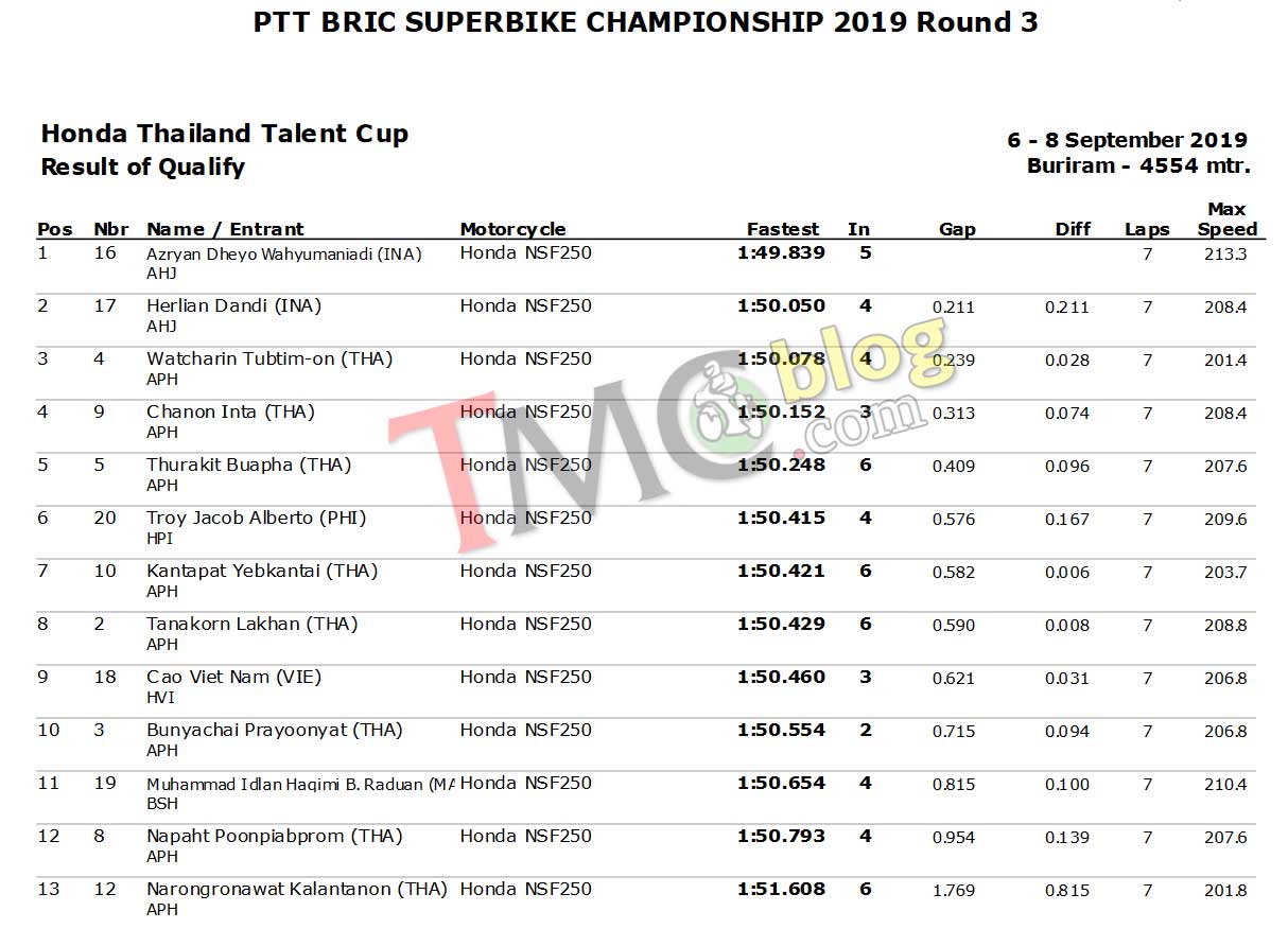 Pada sesi Kualifikasi yang baru selesai Sekeliling Jumat siang tadi Dheyo Wahyumaniadi berhasil menjadi yang tercepat dengan Laptime 1:59,839 dan ebrhak start dari posisi terdepan pada Race 1 esok dan race 2 Lusa. Sementara itu Herlian Dandi Juga menggapai hasil Yang mengesankan di Sesi Kualifikasi dimana Ia berhasil mengamankan posisi start dua dengan hanya terpaut 0,211 detik lebih lelet dari Dheyo. Pembalap Thailand Watcharin Tubtim-On yang sebenarnya sempat tercepat di sesi latihan akan start dari posisi Grid ke 3.
