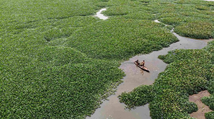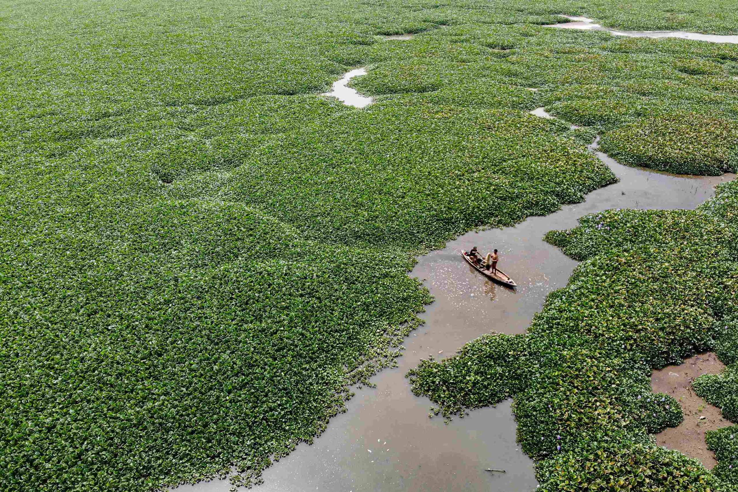 Foto udara kondisi Waduk Selorejo di Kabupaten Malang, Jawa Timur, Jumat (22/8/2025).Masifnya pertumbuhan tanaman gulma eceng gondok di waduk seluas Sekeliling 650 hektare yang berfungsi sebagai irigasi pertanian, perikanan, dan pariwisata itu dikhawatirkan akan menyebabkan pendangkalan. ANTARA FOTO/Muhammad Mada/Ppj
